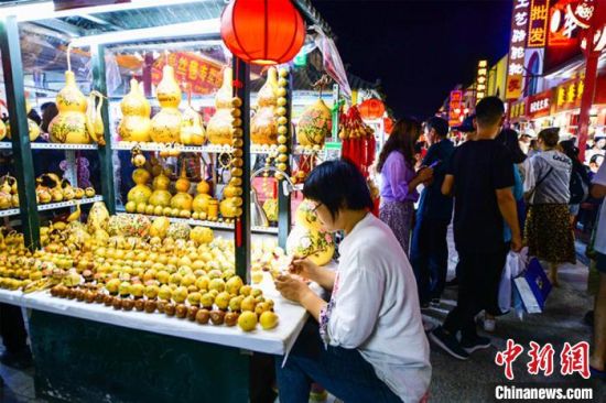 7月29日,游客在敦煌旅游工藝品一條街上漫步,體驗(yàn)濃郁的民俗風(fēng)情和敦煌文化?!⊥醣筱y 攝