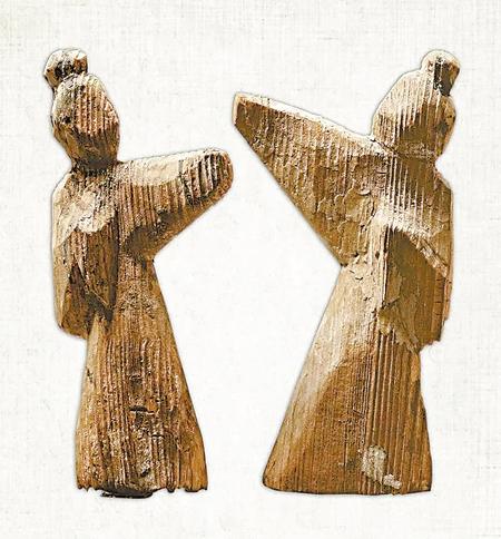 武威磨嘴子漢墓出土,現(xiàn)藏甘肅省博物館的兩件彩繪木舞蹈俑,其中一件寬4.9厘米,厚3.5厘米,高26.7厘米。木俑梳高髻,著長袍,身體向右傾斜,左臂置于胸前,右臂舉起,頭微側(cè),作舞蹈狀。另一件木俑底寬5.4厘米,高14.5厘米,削制而成。以黑、紅兩色繪五官和衣領等。木俑挽高髻,穿袍服。左臂撫胸,右臂向前上舉起,身子傾斜,作舞蹈狀。它們和同一地點出土的漆樽舞蹈畫一樣,都是現(xiàn)實生活中官僚貴族富戶舞伎的藝術(shù)再現(xiàn)。