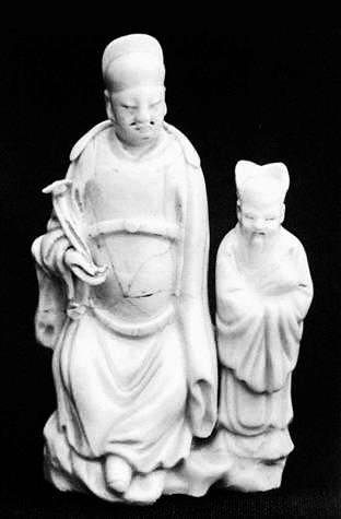 這件白瓷供養(yǎng)人像,為德化瓷人物像,釉面為純白色,色澤光潤明亮。整件雕塑由兩個人物構成,一大一小,一主一副。主像高13.7厘米,身穿典型的明代服飾,人物端坐在山石上,衣著瀟灑,神態(tài)自然從容,盡顯雍容華貴,而手執(zhí)如意則似乎暗示著他內(nèi)心的向往和追求。整個構圖自然放松,給人一種輕松的感覺。小人物則是長髯飄灑,笑容和藹可親,似乎帶著點職業(yè)習慣的微笑,雖然年紀比較大,但卻處于仆從的位置,手里還抱著一卷書。從一個側面烘托出了年輕主人的身份。