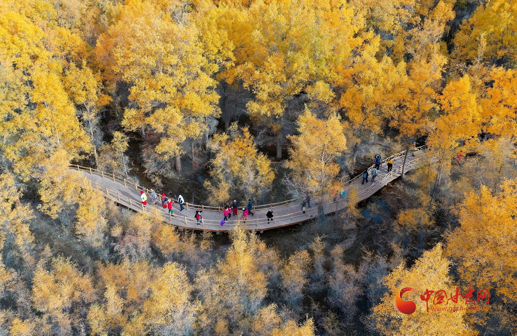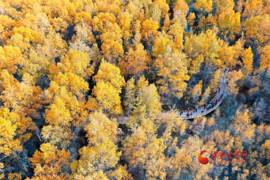 10月10日,在甘肅省酒泉市金塔沙漠胡楊林景區(qū),胡楊林在陽光的照耀下金黃燦爛,與湖水相映,令人流連忘返。(無人機照片)