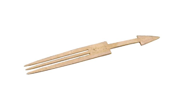 再看一柄骨叉,這柄骨叉同樣是齊家文化時期的產(chǎn)物,距今有4000年之久了,若不是文物標(biāo)明年代,真不敢相信它是數(shù)千年前的先民所制。這柄骨叉長15.8厘米、寬1.8厘米、厚0.2厘米,叉部呈長方形,尖端為三齒,細長方形柄,柄端呈三角形。去掉柄端的三角造型,這柄骨叉與現(xiàn)在餐桌上的叉子有什么分別呢?最難得的是,這柄骨叉制作得如此規(guī)整,打磨得這般光滑,想想看,它可是新石器時代先民的手工活,制作竟如此精美,真令人嘆服!
