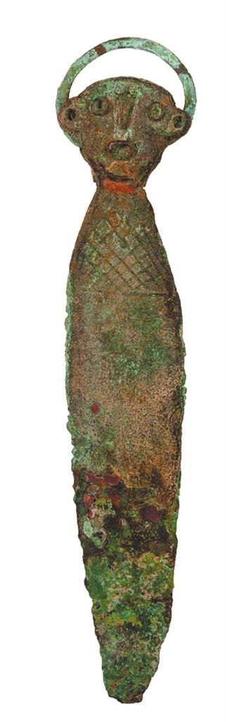 相比刀與叉,匕的出現(xiàn)要稍晚一些,甘肅省博物館收藏有人頭柄銅匕兩把,都是辛店文化(距今3400年—2800年)的產(chǎn)物,兩把人頭柄銅匕都采集于甘肅省廣河縣。一把人頭柄銅匕造型比較拙樸,匕身平直呈長舌狀,末端為圓弧形并微上翹。柄首為人頭形,高鼻,圓眼,厚唇微張,半環(huán)形雙耳,一耳殘缺。另一把人首柄銅匕同前一把人頭柄銅匕造型相似,但做工卻要精美許多,這把銅匕柄首也是人頭形,高鼻,圓眼,圓口,雙耳為半環(huán)形,頸部涂紅色,身體為方格網(wǎng)紋。這把人頭柄的人面雙目圓睜,嘴微張,一副機靈驚詫的表情,比前一把人頭柄銅匕人面憨直質(zhì)樸的面目更有意趣。這是兩把還沒成為武器的銅匕,但它已經(jīng)有了勺子的雛形。