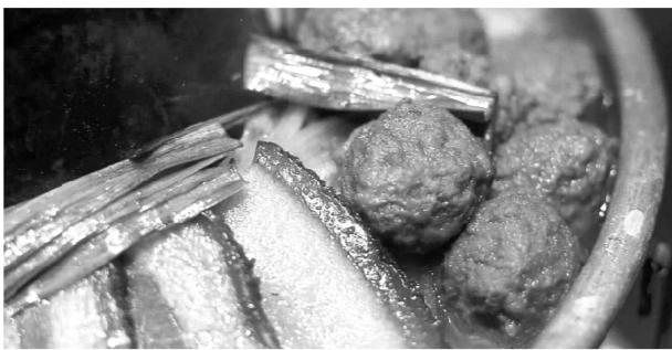 紅燒肉還有番外篇,一碗熬蘿卜燒肉讓此行臻于完美。熬,此處念平聲跟我們通常所說的煮菜有些類似,但不同的是,煮菜用清水,熬菜用肉湯。熬蘿卜會(huì)吸收湯的香味,變得軟糯爽口,這也就是熬菜的精妙之處。簡(jiǎn)單地爆香蒜苗,加上幾片做好的紅燒肉,蓋在這蘿卜上,于是一碗高端大氣的菜品就出現(xiàn)了。