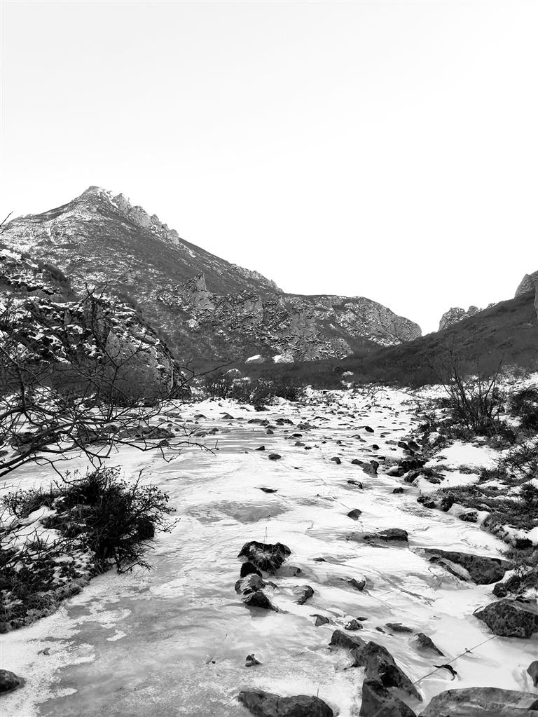 穿過(guò)公路就來(lái)到露骨山腳下,山間灌木叢生,枯葉凋零,一夜的小雪也使天空更加清澈。上山的路,總體是溯溪而上,不過(guò)腳下的小溪已經(jīng)變成冰河,但潺潺水聲不時(shí)在耳邊響起,大小石塊橫亙?cè)诒又希籽└采w其間,我們一行沿著前人在雪地留下的腳印,撥開(kāi)齊胸的灌木枝,深一腳淺一腳、兜兜轉(zhuǎn)轉(zhuǎn)向前行。