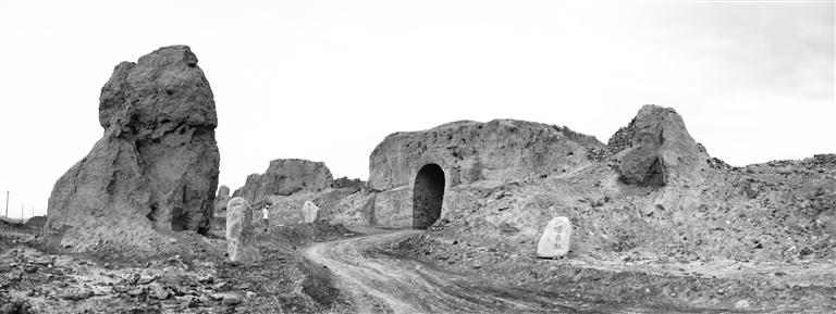 在鄉(xiāng)村公路邊,有人工擺放的怪石,上面有各種字體的書法石刻。這是山丹縣傾力打造的中國西部長城文化書法石刻長廊的一部分,這個石刻長廊工程陳列了600多方名家書法石刻,到峽口古城前還有模擬太極八卦圖的展示……