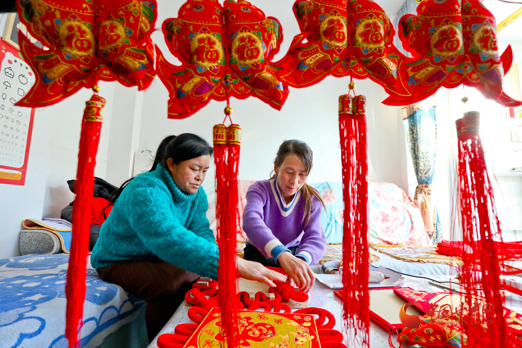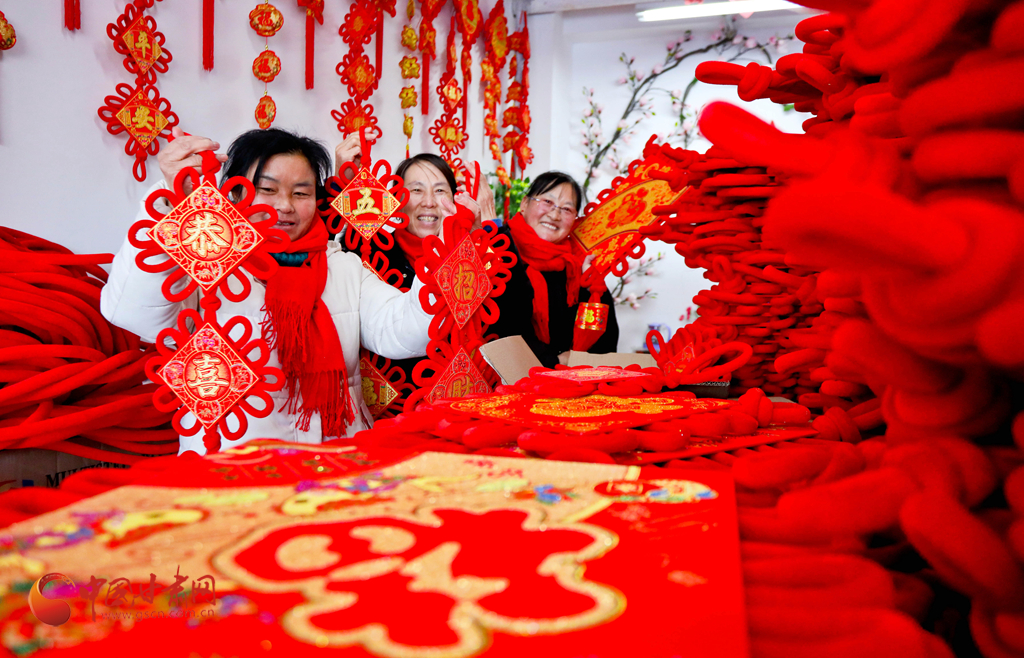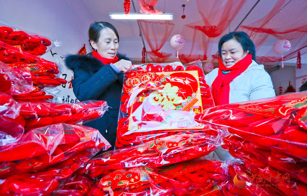 1月6日,甘肅民樂生態(tài)工業(yè)園區(qū)的巾幗扶貧車間內,編織女工正在緊張忙碌地抓緊編織中國結,供應節(jié)日市場,喜迎新春。