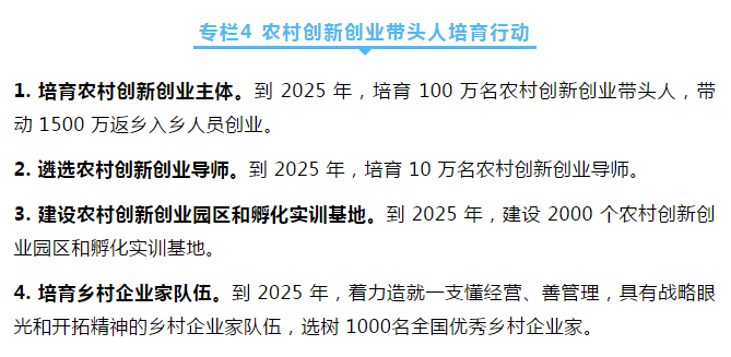 深入實(shí)施農(nóng)村創(chuàng)新創(chuàng)業(yè)帶頭人培育行動,加大扶持,培育一批扎根鄉(xiāng)村、服務(wù)農(nóng)業(yè)、帶動農(nóng)民的創(chuàng)新創(chuàng)業(yè)群體。