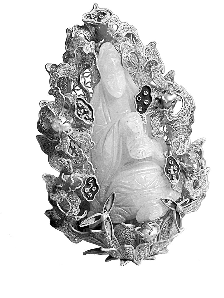 1986年,蘭州市博物館對白衣寺塔進(jìn)行整體維護(hù),從塔剎天宮處發(fā)現(xiàn)明代珍貴文物46件,其中有《大方廣佛華嚴(yán)經(jīng)》、鎏金釋迦牟尼銅造像、明代印花絲巾等文物,尤其是金蓮玉雕抱子觀音簪和金蓮玉雕魚籃觀音簪,造型精致,做工精美,表現(xiàn)了很高的明代金累絲手工制造技術(shù)水平,簪柄有銘文21字,“崇禎五年捌月初拾日肅王妃熊氏施伴讀姚進(jìn)兼裝”,被定級為國家一級文物。
