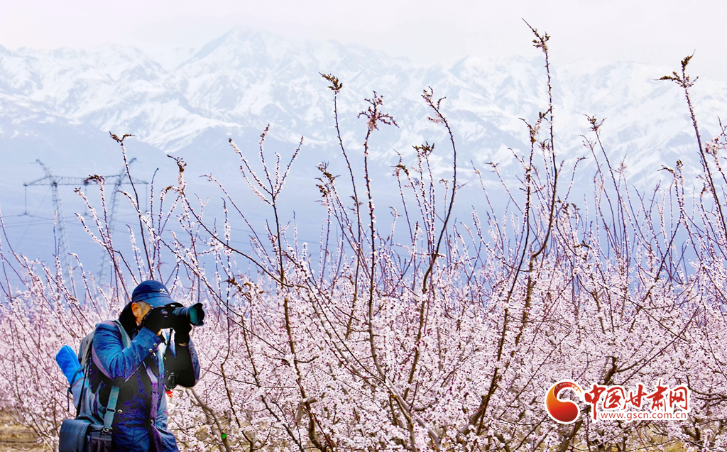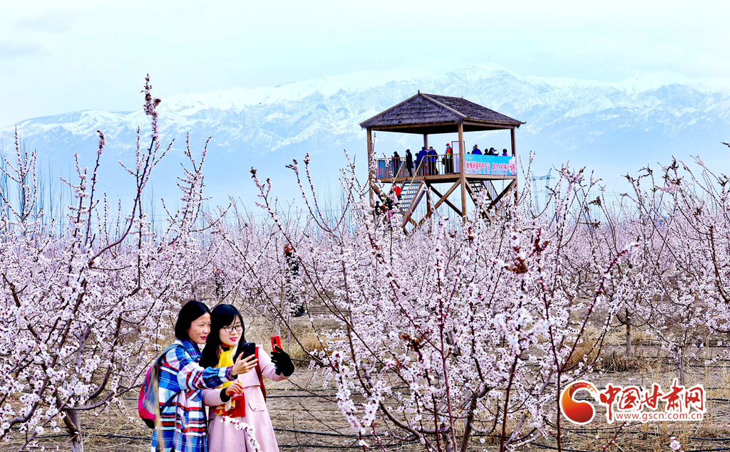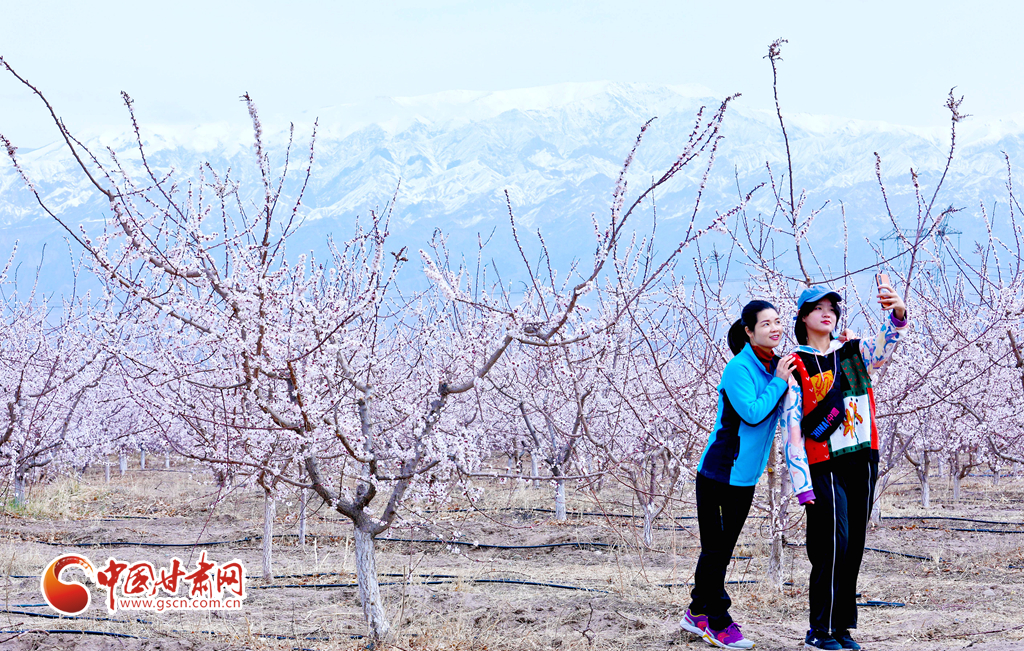 4月3日,游客在祁連山下的甘肅張掖甘州區(qū)金滿(mǎn)園千畝杏園種植基地里賞花和拍照留念。