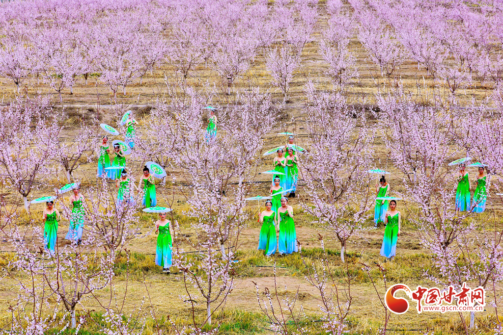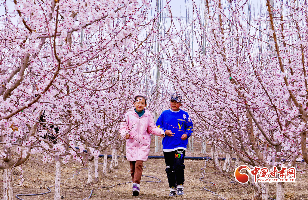 4月3日,小朋友在甘肅張掖甘州區(qū)金滿(mǎn)園千畝杏園種植基地杏花園里跳起了《春之舞》。
