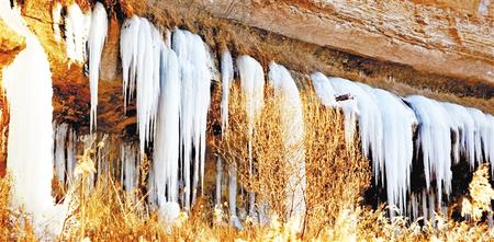 小路隨著山勢(shì),曲折延伸。對(duì)面荒坡上隨處可見(jiàn)大大小小的洞穴,不知是經(jīng)年風(fēng)蝕,還是人工開采沙子所致。洞穴四周,散落著小小的冰瀑,有的似乎只有盈盈一握。長(zhǎng)長(zhǎng)短短的冰掛,一綹一綹,一排一排,遠(yuǎn)遠(yuǎn)近近錯(cuò)落有致地覆在山坳里,垂在砂石間,掛在懸崖上。一些細(xì)細(xì)長(zhǎng)長(zhǎng)的冰溜,像極了臘月里母親剛出鍋的粉條。搭在院子竹竿上的一掛粉條,下邊還垂著水珠,上邊早已凍成了細(xì)細(xì)的冰棒,而滴落在地上的水已凝成了冰堆。