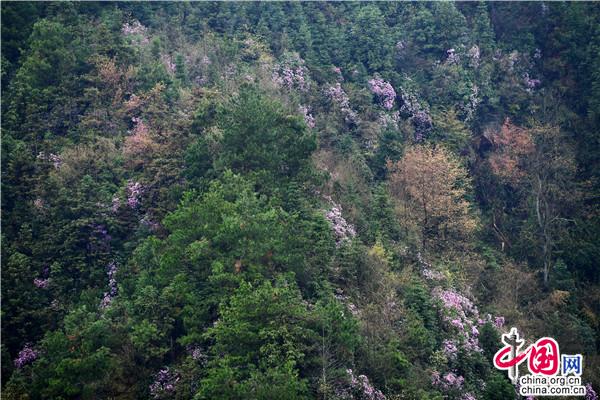 春天的穿巖山國家森林公園,漫山花開,層林盡染春色。這時候的野櫻花、野杜鵑、野映山紅竟相綻放,條條游步道宛如一條條花帶,帶著生機勃勃和滿天飄舞的芳香,讓游人心曠神怡。走在一條條蜿蜒的棧道,鮮氧環(huán)伺,鼻息間盡是春風吹來的清新氣息。這里人文歷史與自然美景交融,既可在蜿蜒的茶馬古道,重走紅軍路,感受偉大的革命精神,又可在越河而建、凌空百丈的5D玻璃橋體驗漫步云端的驚險刺激,還可在寧靜愜意的云端古村落,感受淳樸的民風和歷史悠長的農(nóng)耕文化奇葩。早晨的日出云海,中午的藍圖白云,下午的燦爛夕陽,鮮花與藍天、彩霞相映,讓人流連忘返。漫山遍野的綠意間,成團櫻花、杜鵑、映山紅等夾雜其中,或粉紅或雪白,或紫色或丹紅,密密匝匝開滿枝頭。由于雪峰山景區(qū)的落差較高,從300米到1500米,櫻花期、杜鵑花期、映山紅花期交錯,成梯級往山背梯田景區(qū)、虎形山大花瑤綻放開來,讓賞花期能長達2、3個月之久。