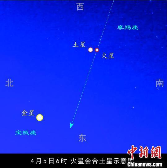 天文專家介紹稱,近日,火星和土星都位于摩羯座,火星由西向東追趕著土星。4月4日,火星將出現(xiàn)在土星的西南面,兩者相距0.9度;4月5日6時(shí),火星將追上土星,二者位于同一條經(jīng)線上,兩者相距0.3度。但這還不是二者最短的距離,根據(jù)理論計(jì)算,再過(guò)幾個(gè)小時(shí),火星和土星才距離最近。圓圓的滿月的視直徑約為0.5度,如果滿月在火星和土星的前面經(jīng)過(guò),就可把它倆全部遮掩。4月6日,火星在土星東南面,兩者相距0.6度。