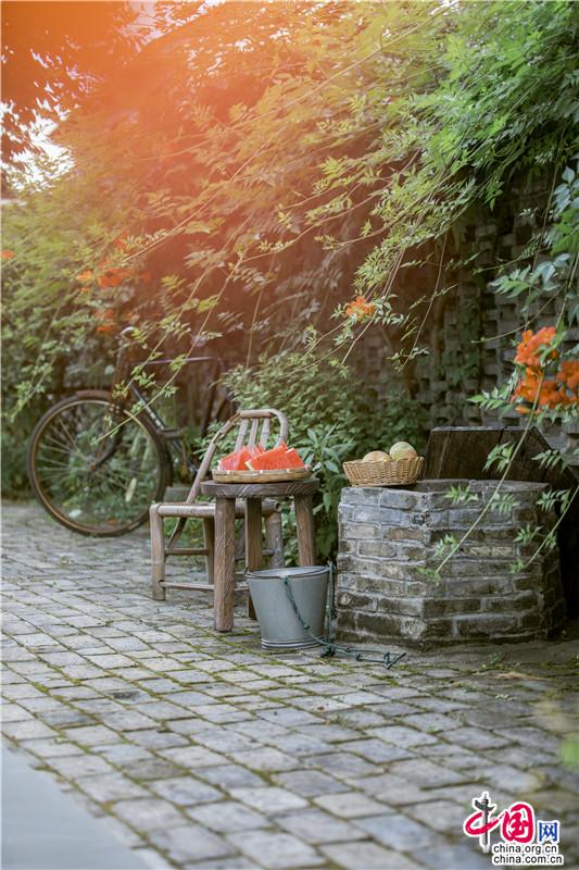 一縷陽光從藤蔓間落下,微風(fēng)激醒了夏日的小院、水井、西瓜、竹椅......自然與肌理糅合陶然入夏。香村的一切,無一不村野,無一不夏天。