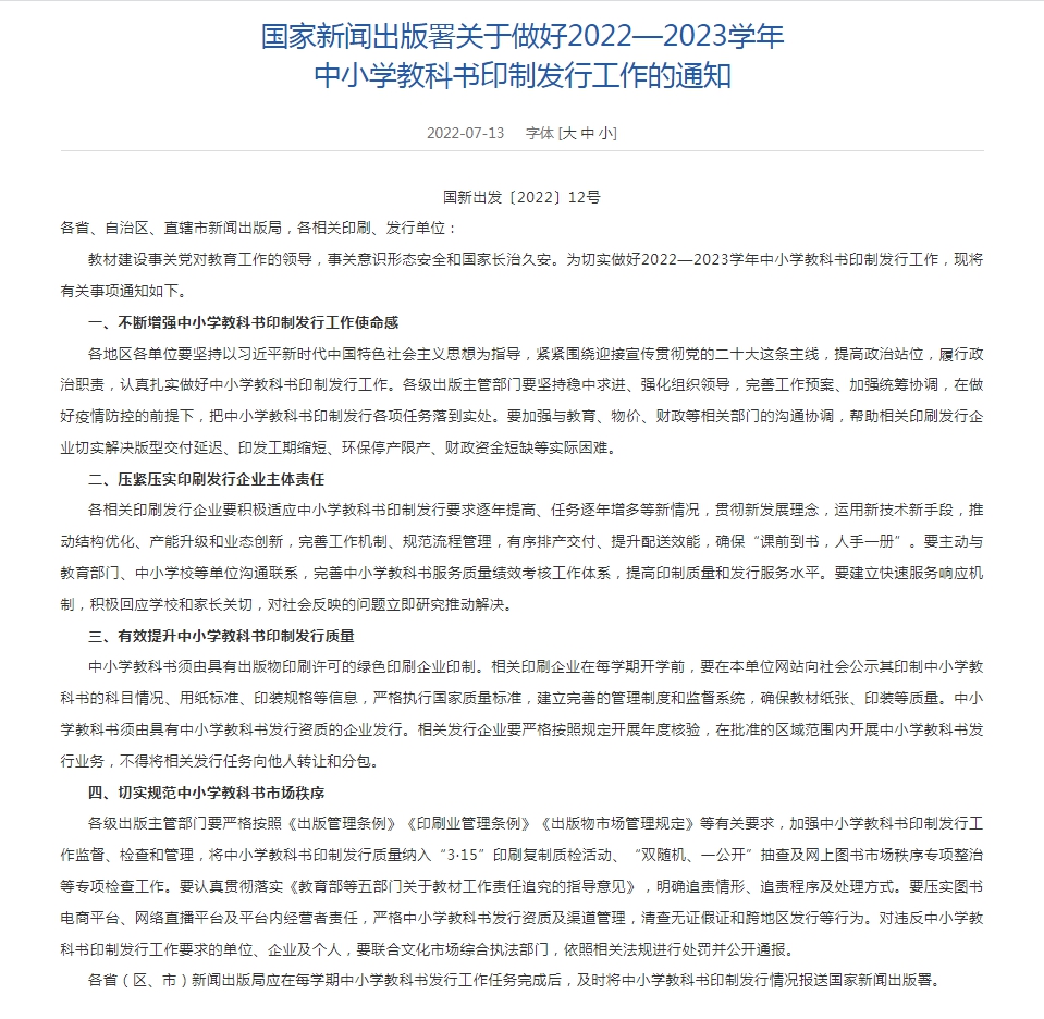 13日,國家新聞出版署網(wǎng)站發(fā)布《國家新聞出版署關(guān)于做好2022—2023學(xué)年中小學(xué)教科書印制發(fā)行工作的通知》(以下簡稱《通知》)。其中強(qiáng)調(diào),各相關(guān)印刷發(fā)行企業(yè)要積極適應(yīng)中小學(xué)教科書印制發(fā)行要求逐年提高、任務(wù)逐年增多等新情況?!锻ㄖ返淖詈蟊硎?,要切實(shí)規(guī)范中小學(xué)教科書市場秩序。