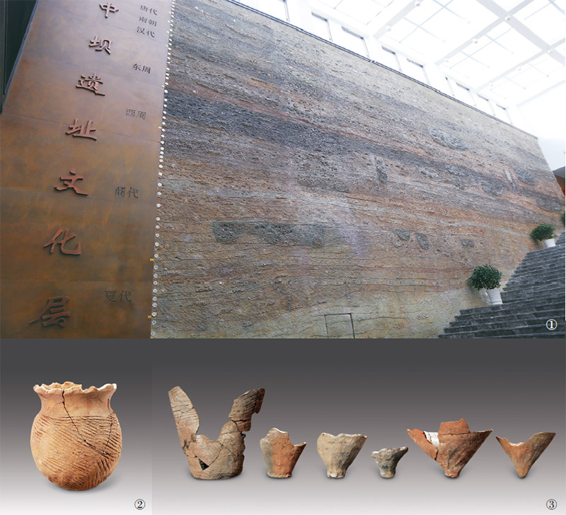 重慶中壩遺址出土的地層文物,完整包含了新石器時代晚期、夏商周、秦漢、魏晉南北朝、唐宋元明清不同時代的所有地層,可以讓人們直觀感受到中華五千多年文明綿延不絕的偉大與震撼。圖1為中壩遺址剖面還原圖(圖片來源:重慶市忠縣縣委宣傳部)。圖2、圖3分別為中壩遺址出土的制鹽陶器花邊口圜底罐、花邊口尖底缸底(圖片來源:科學(xué)出版社)。