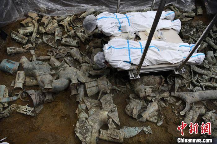 8號(hào)祭祀坑等待提取的青銅神獸。張浪 攝