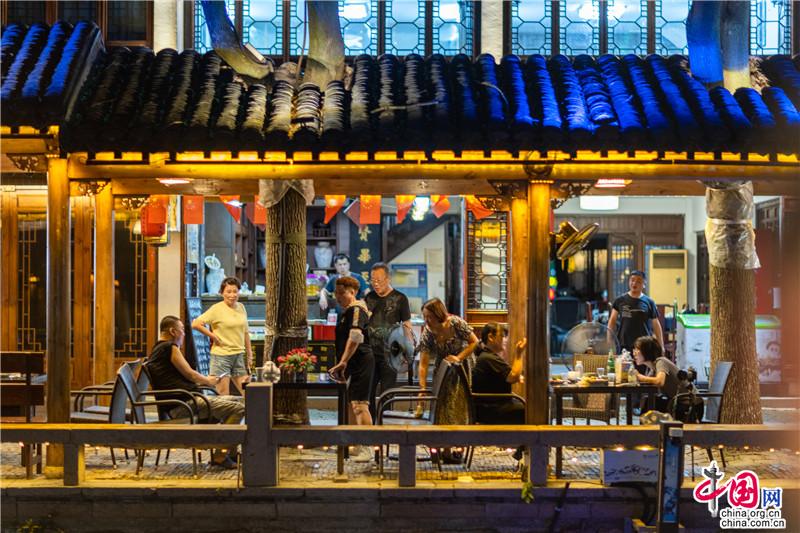 歸來小鎮(zhèn),夜色燈火閃爍搖曳,廊亭中清風肆意流連,明月照進街巷里弄,清涼夜周莊,是夏日里的烏托邦。小橋流水與青磚黛瓦交錯成景,輕姿漫步看兩岸燈影交錯;成蔭的綠意里畫著水色繾綣,抬眸皆是神來之筆。夏夜的煙火人間里,是迷人而慵懶的江南底色。