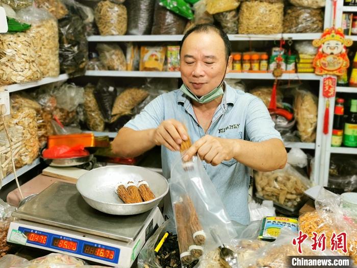 資料圖為廣東臺山富城市場內(nèi),一藥材檔的老板為顧客用密實袋打包參絲。 中新社發(fā) 李曉春 攝