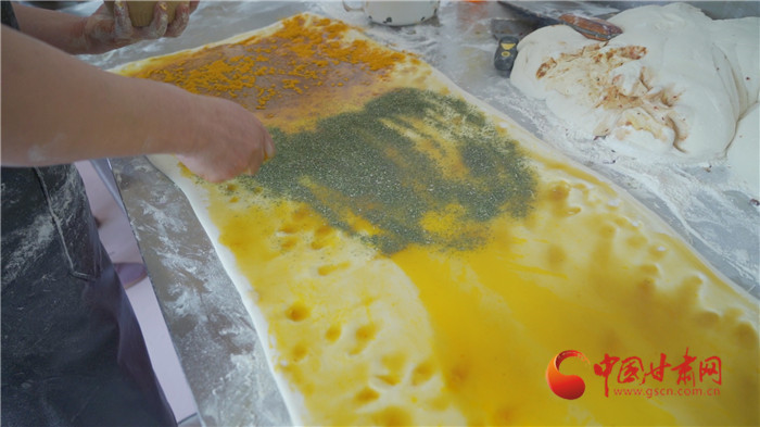記者走進(jìn)榆中縣金崖鎮(zhèn)浩燕饅頭店,一股濃濃的胡麻油、玫瑰醬、香豆等混合的香氣撲面而來,李浩燕正在忙碌地趕制一批榆中傳統(tǒng)手工月餅。案板上除了發(fā)好的面團(tuán),還擺上了炒胡麻碎、姜黃、白砂糖等豐富的佐料。只見李浩燕從揉面開始,然后鋪餡、搟制、卷面、切分、披花,一道道工序一氣呵成。經(jīng)過一個多小時,新鮮美味的月餅出爐了,切開后,內(nèi)里豐富,色彩斑斕,咬上一口軟糯可口,回味留香。