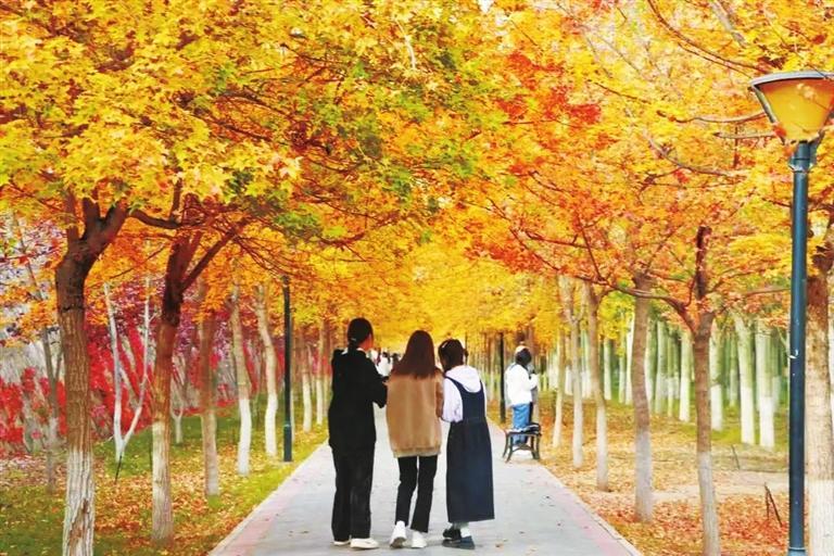 微風輕拂,嬌黃的樹葉紛紛飄落,陽光透過葉片滲出幾分清朗,這是專屬秋的浪漫。隨便鋪開畫紙,蘸取一點點秋色,藍天、紅墻、金葉……都是最美的色調(diào)。古樸靜雅的校園彌漫著秋思,斑駁的陽光灑在圖書館的墻上,在濃濃的書卷氣中把農(nóng)歷十月寫進秋的詩行,有思念、有沉淀、有墨香……蘭州“醉”美的大學(xué)校園,每一片落葉都是美的化身,綿延了時光,溫情了步履……