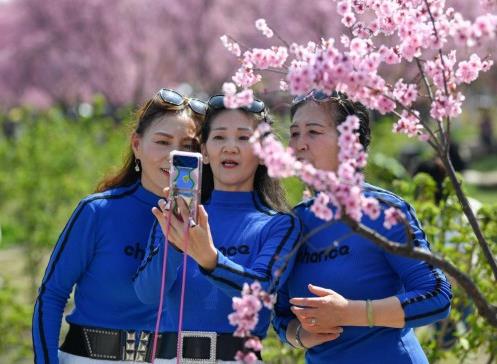 3月8日,游人在都江堰市青城山鎮(zhèn)“問花村”自拍