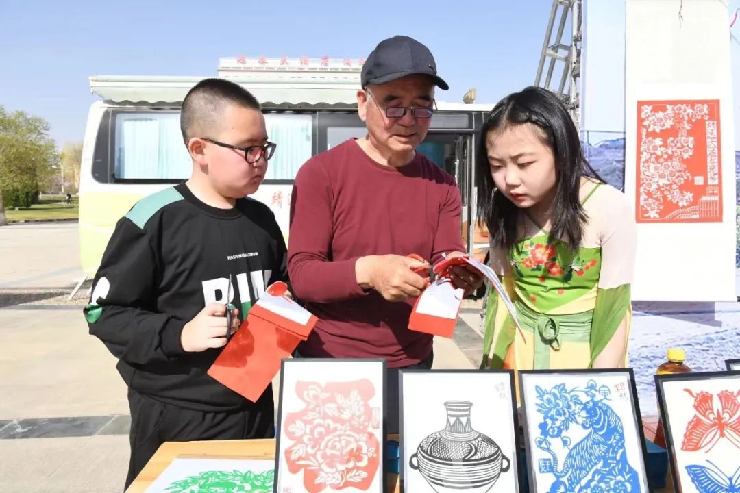 市級非遺保護傳承項目靖遠剪紙傳承人王世義正在教小學生剪紙。喬麗霞 攝
