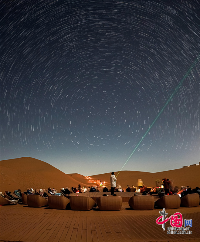 在沙漠區(qū),游客晨觀大漠日出,昏賞沙海夕陽,夜晚宿在星星酒店,感受躺在床上看星星的奇妙體驗(yàn),在星咖啡手工制作星星原木版畫,在五行沙療室滋養(yǎng)生命的每一個(gè)細(xì)胞,在觀星谷跟著星空講師春看獅子座、夏觀銀河、秋尋仙女座、冬追獵戶座,期待與一場(chǎng)流星雨的不期而遇。