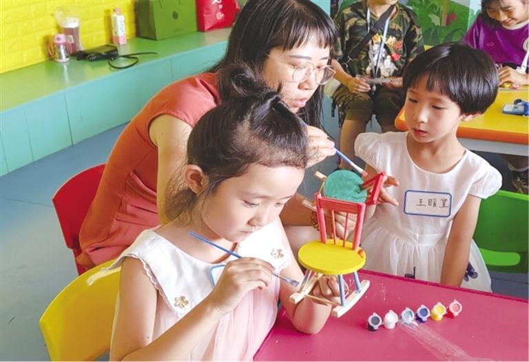 為了讓孩子們切身體驗魯班的精湛技藝,在手工制作環(huán)節(jié),大家進行了榫卯結(jié)構(gòu)的椅子模型拼裝。在主持人的帶領(lǐng)指導下,孩子們將椅背、椅腿按照凹槽精準嵌入,并為其染上五彩底色、繪制精美圖案,一個個“小工匠們”便歡天喜地地完成了自己的手工作品。