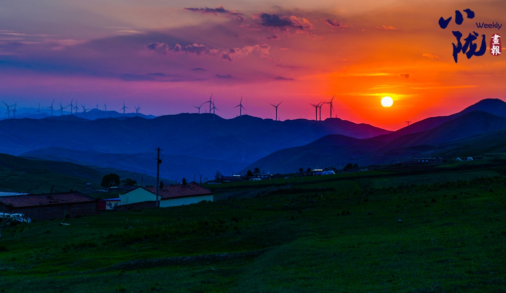 晚霞染天際,崇山峻嶺間,一臺(tái)臺(tái)風(fēng)力發(fā)電機(jī),像一排排駐守在各個(gè)山頭的哨兵,挺立著身軀,成為新墩灣草原的獨(dú)特風(fēng)景。