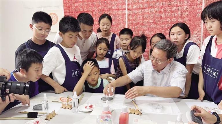 孩子們?cè)诓┪镳^感受拓印魅力 安若璇 攝