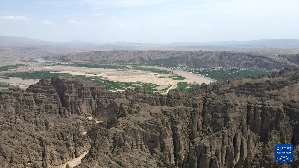 這是位于甘肅省白銀市景泰縣中泉鎮(zhèn)龍灣村的黃河石林景觀。黃河石林千峰競(jìng)奇、峽谷蜿蜒,與黃河遙相呼應(yīng),形成山環(huán)水轉(zhuǎn)、動(dòng)靜結(jié)合的自然奇觀(7月11日攝,無(wú)人機(jī)照片)。新華社記者 方欣 攝