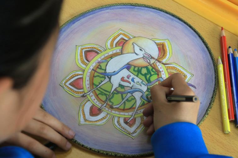 敦煌市西關小學美術社團的學生正在為帶有敦煌壁畫元素的團扇畫圖上色。張曉亮 攝