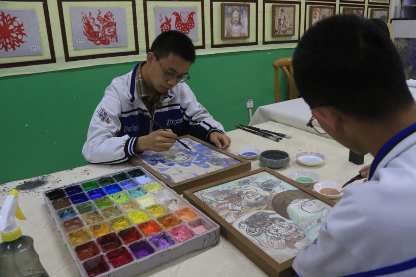敦煌中學的學生在學校畫室里臨摹敦煌壁畫。張曉亮 攝