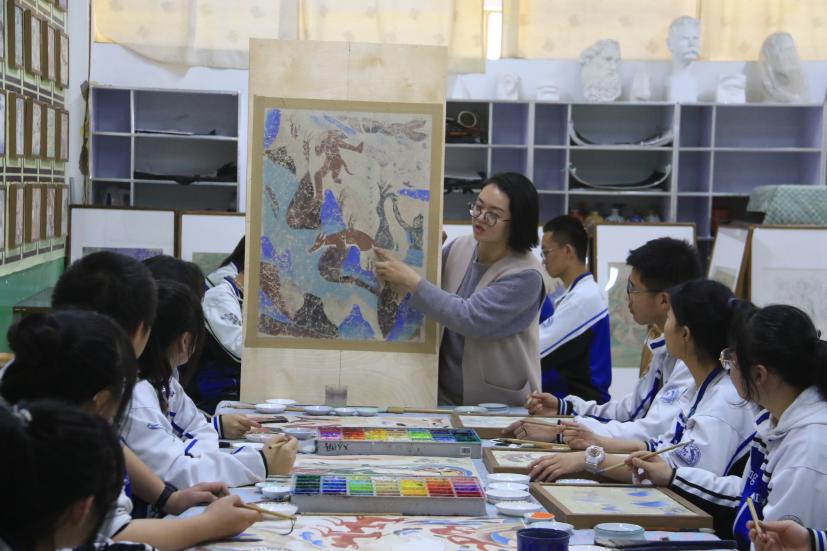 敦煌中學美術教師楊娜為學生講解敦煌壁畫藝術。張曉亮 攝