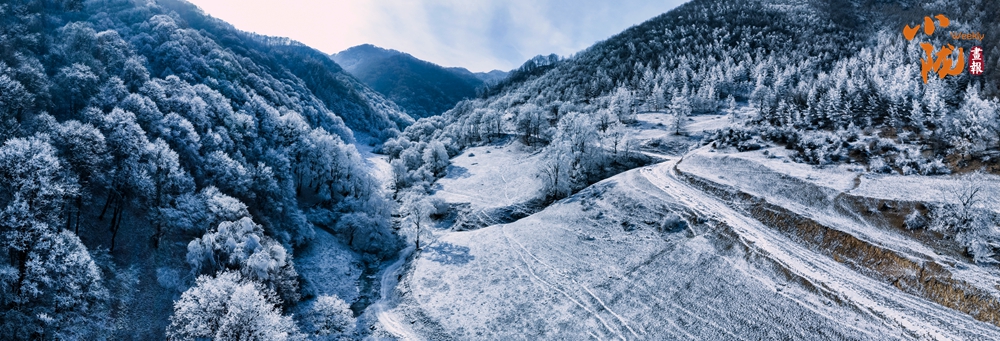 關(guān)山被白雪覆蓋,滿山樹(shù)木掛滿了晶瑩的雪花,好像穿上了潔白的婚紗,格外美麗。