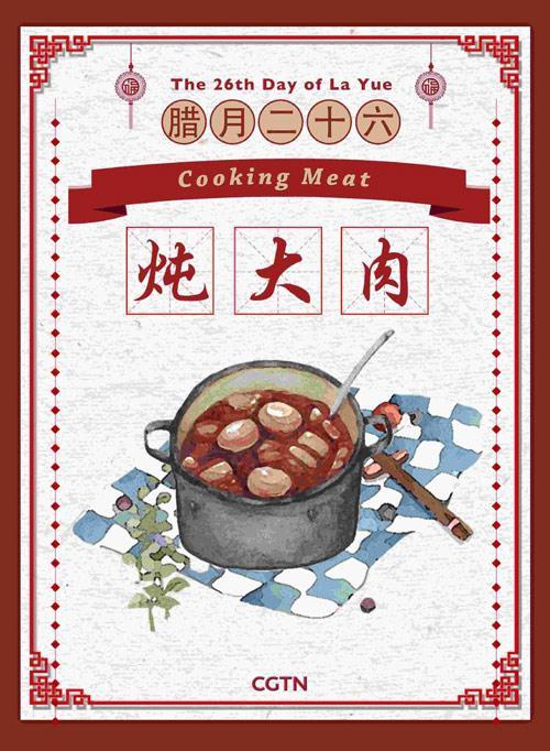 臘月二十六這天,許多家庭通常都會(huì)燉豬肉和吃豬肉。不養(yǎng)豬的家庭會(huì)去當(dāng)?shù)丶匈I一大塊肉。在過(guò)去的農(nóng)業(yè)社會(huì),人們只有在春節(jié)才能吃上肉。吃肉也代表著一年中最盛大的慶?;顒?dòng)。