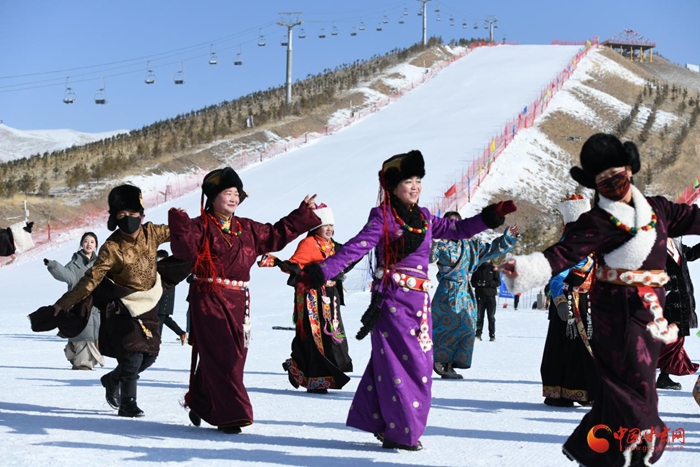 銀裝素裹的“冰雪嘉年華”現場,來自當地的干部群眾身著節(jié)日的盛裝和游客們一起,隨著音樂的旋律,跳起了鍋莊。游玩區(qū),大人小孩參與其間,體驗雙板滑雪、雪圈、雪地自行車等多種娛樂項目,歡聲笑語彌漫著整個雪場。