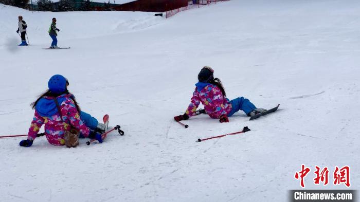 圖為臺胞青年滑雪摔倒瞬間。王牧雨 攝