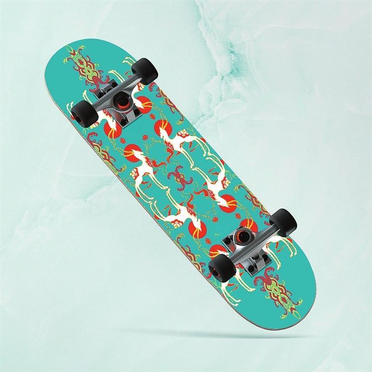九色鹿滑板——以敦煌壁畫與極限運動相結(jié)合的設(shè)計,不僅讓傳統(tǒng)文化玩出了新花樣,同時掀起了一場以敦煌文化為代表的傳統(tǒng)文化消費潮。九色鹿滑板,既代表年輕人的活力和動力,又融合了神秘敦煌的藝術(shù)風(fēng)格。以九色鹿為創(chuàng)意靈感的敦煌九色鹿系列聯(lián)名滑板,用扁平插畫風(fēng)格進(jìn)行再創(chuàng)作,用纖細(xì)柔美的線條凸顯九色鹿的優(yōu)美身姿,既保留傳統(tǒng)圖案的華麗精巧,也符合現(xiàn)代審美。