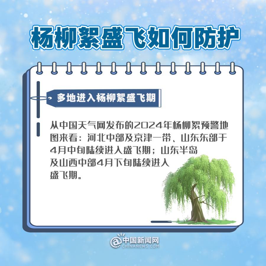 從中國天氣網(wǎng)發(fā)布的2024年楊柳絮預警地圖來看:河北中部及京津一帶、山東東部于4月中旬陸續(xù)進入盛飛期;山東半島及山西中部4月下旬陸續(xù)進入盛飛期。楊柳絮都有哪些危害?公眾日常如何做好防護?
