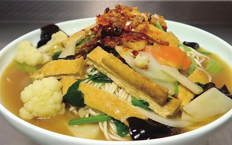 搭配吸滿醬汁的油炸凍豆腐,再淋上一口酸辣蒜汁,這種來自碳水的誘餌很難令人抵抗。蘭州鹵面的面條與牛肉面一樣,都是技藝精湛的拉面師傅親手拉出來的,湯汁用油炸凍豆腐和多種素菜混以牛肉面原湯勾芡,文火慢煮,再澆到新出鍋的面條上。