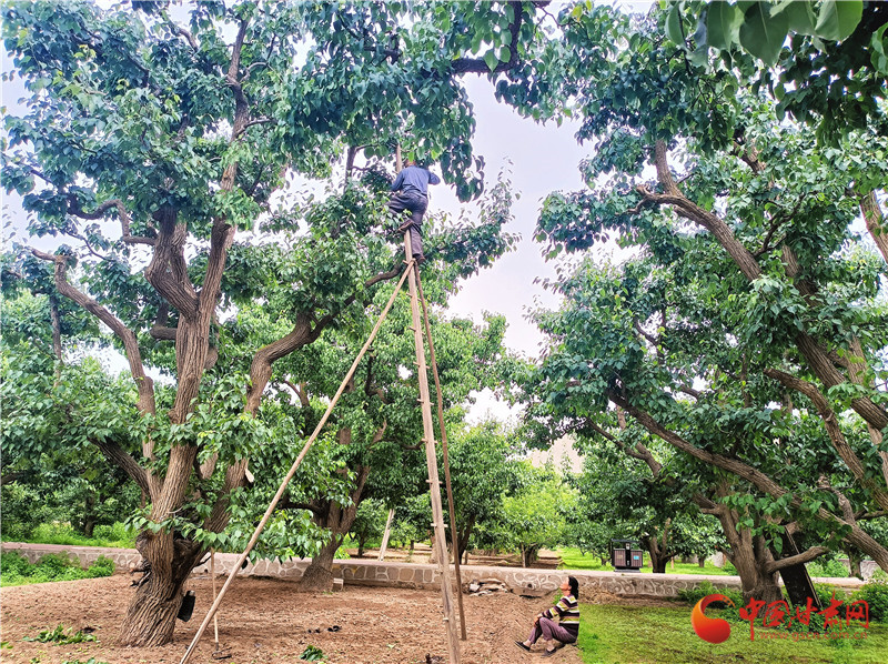 初夏走進(jìn)古梨園,梨樹進(jìn)入疏果期,腳登“蜈蚣梯”的“天把式”又開始忙碌了。