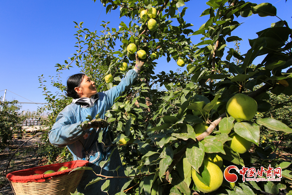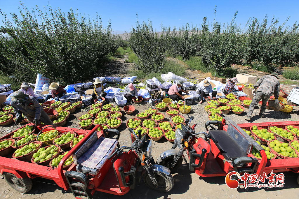 8月17日,位于祁連山下的甘肅省嘉峪關(guān)市文殊鎮(zhèn)豐源農(nóng)業(yè)科技示范園1850余畝戈壁早酥梨喜獲豐收,果農(nóng)們正忙著采摘、分揀、裝箱、儲(chǔ)存。