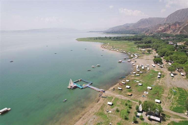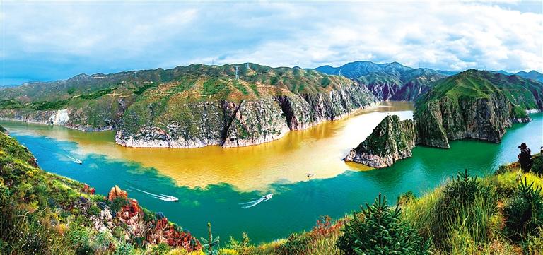 提及永靖劉家峽,第一反應(yīng)就是一個成語——“涇渭分明”。受上游降水影響,洮河河水比較渾濁,在與黃河交匯處劉家峽水庫的清波“相遇”時,形成一清一黃兩股水流,河流呈“Y”字形交匯。交融卻不滲透,加上河中的石山,猶如兩條巨龍游戲于此,在當(dāng)?shù)剡@一景象也被稱為“二龍戲珠”。初秋時節(jié),來自全國各地的游客站在黃洮交匯觀景臺上,感受這份來自大自然的震撼與壯美,從高處遠(yuǎn)眺入河口,“黃河清,洮河黃”,可謂“涇渭分明”,景色極為壯觀。