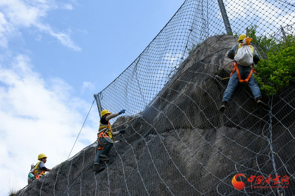 近日,隴海鐵路魏家磨1號(hào)隧道上方的山體上,蘭州鐵路局定西工務(wù)段新陽鎮(zhèn)橋路養(yǎng)修工區(qū)的作業(yè)人員,一手抓安全繩,一手拿檢查錘,攀附在懸崖峭壁上仔細(xì)排查防護(hù)網(wǎng)內(nèi)危石情況,及時(shí)消除落石隱患。