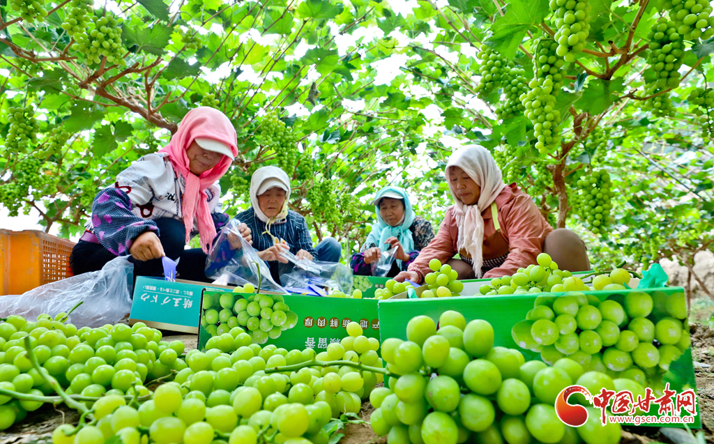 8月28日,在高臺縣南華鎮(zhèn)智號村1000畝陽光玫瑰葡萄綠色標(biāo)準(zhǔn)化產(chǎn)業(yè)園內(nèi),40多萬斤陽光玫瑰進(jìn)入成熟采摘期,果農(nóng)們正在采摘、分揀、裝箱,準(zhǔn)備發(fā)往浙江、江蘇、新疆、青海、內(nèi)蒙古等地客商的手中。