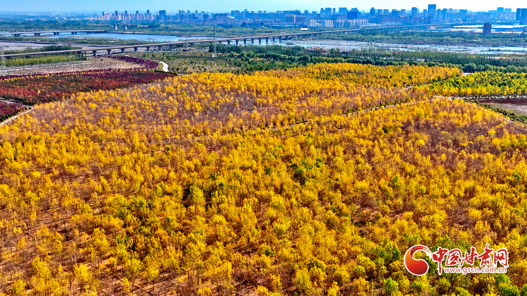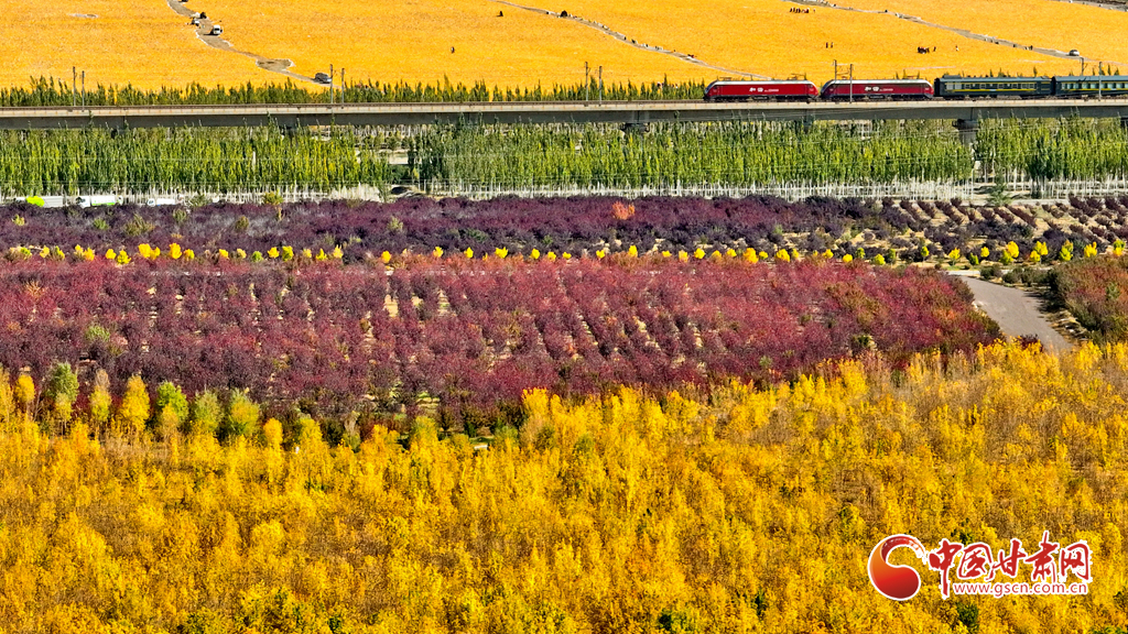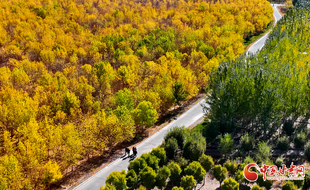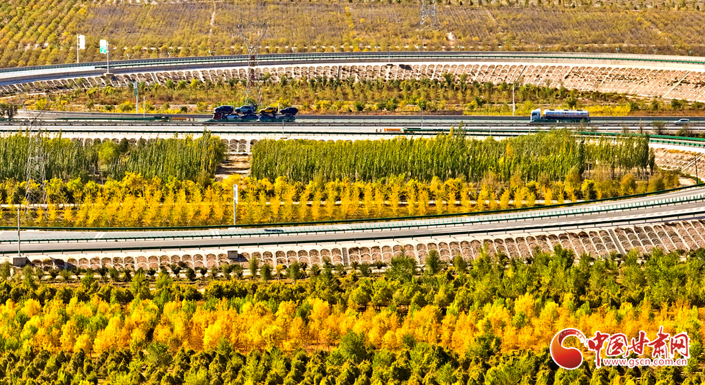 金秋時(shí)節(jié),張掖市甘州區(qū)的黑河兩岸,生態(tài)防護(hù)林的樹葉逐漸披上金色與紅色,景色迷人。尤其是那延綿的人工胡楊林景區(qū),金黃一片,層巒疊嶂,美不勝收。蘭新高鐵與連霍高速穿梭于這片林海之中,構(gòu)成了一幅動人的風(fēng)景線。這里的空氣純凈、環(huán)境寧靜、負(fù)氧離子含量豐富,成為了游客和市民休閑觀光的理想之地。
