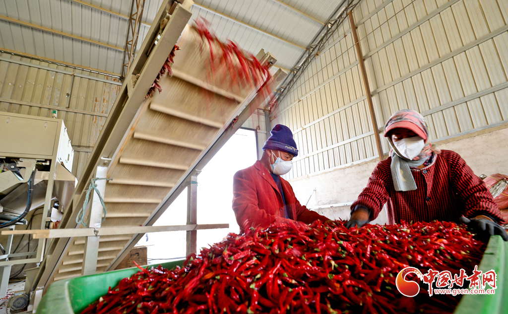 10月29日,張掖市臨澤縣新華鎮(zhèn)勝利村辣椒加工廠內(nèi),工人們正在為河南、山東的客商加工500噸紅辣椒干。