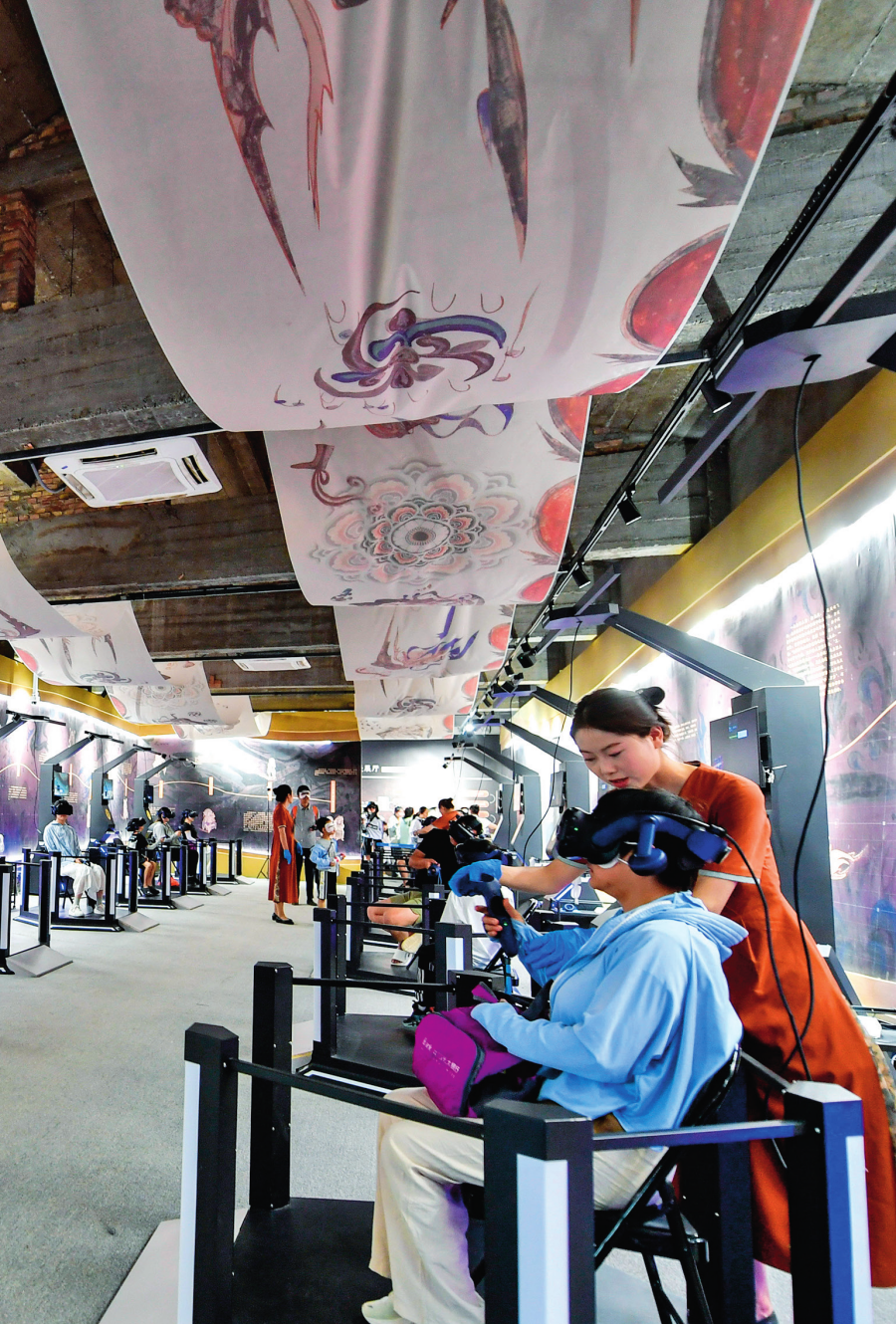 游客在敦煌體驗(yàn)“尋境敦煌——數(shù)字敦煌沉浸展”(2024 年 7 月 22 日攝) 郎兵兵攝 / 本刊